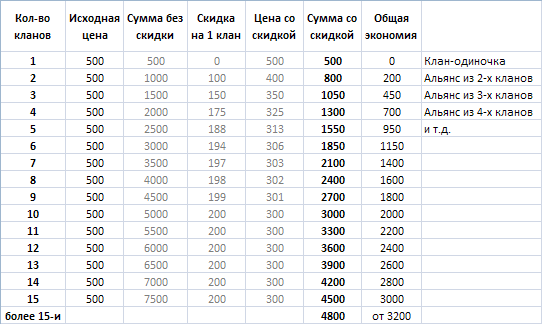 б) для аккаунта и клана: 1) + 2) – 900 рублей (вместо 1100, экономия – 200 рублей);